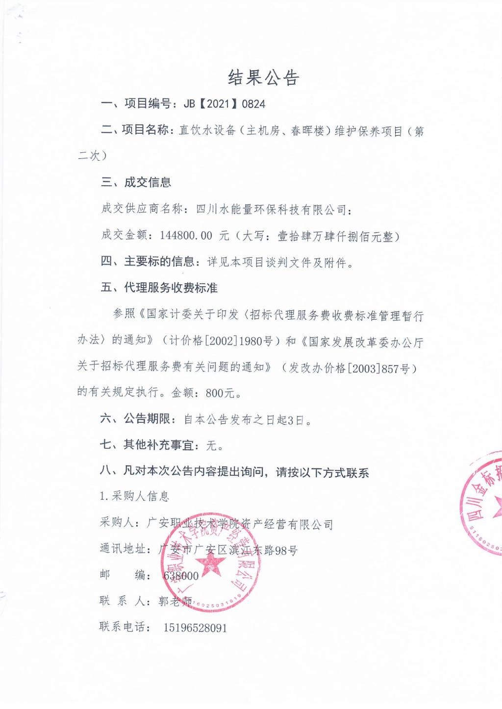 直饮水设备(主机房、春晖楼)维护保养项目(第二次)结果公告