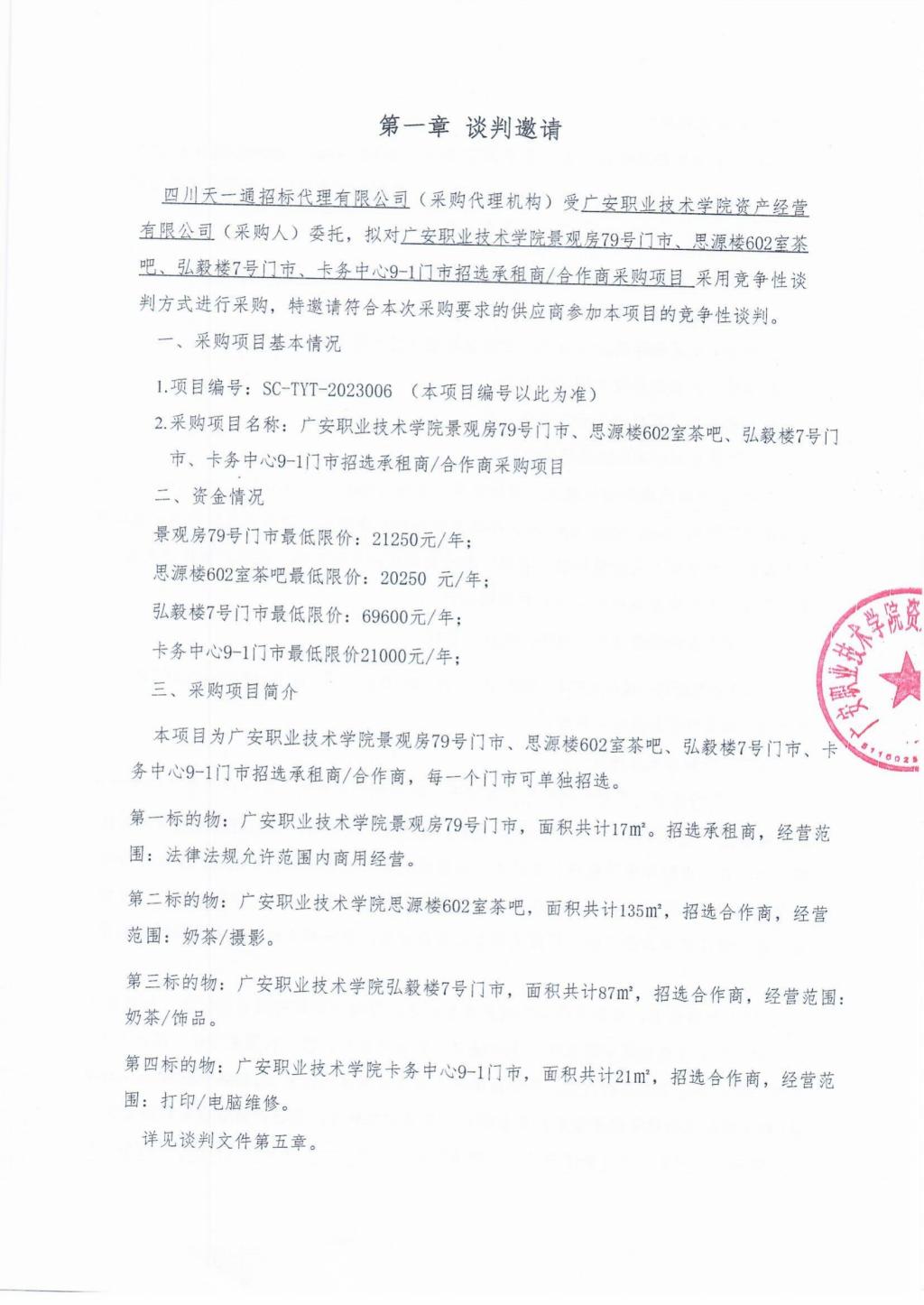 广安职业技术学院景观房79号门市、思源楼602室茶吧、弘毅楼7号门市、卡务中心9-1门市谈判邀请公告