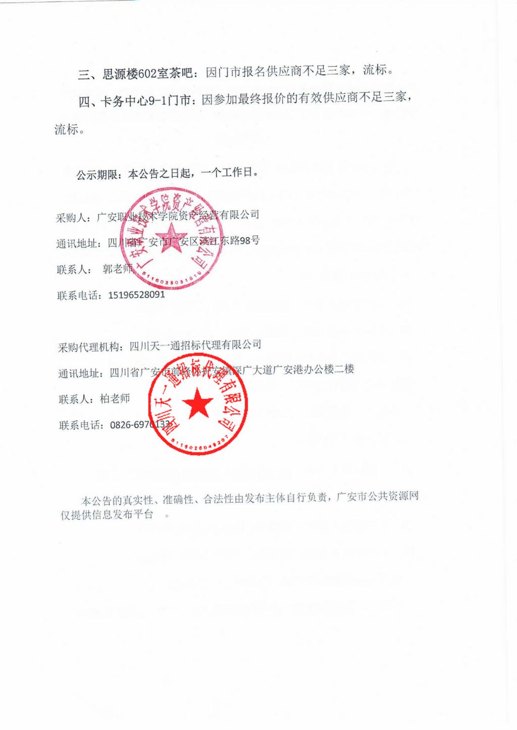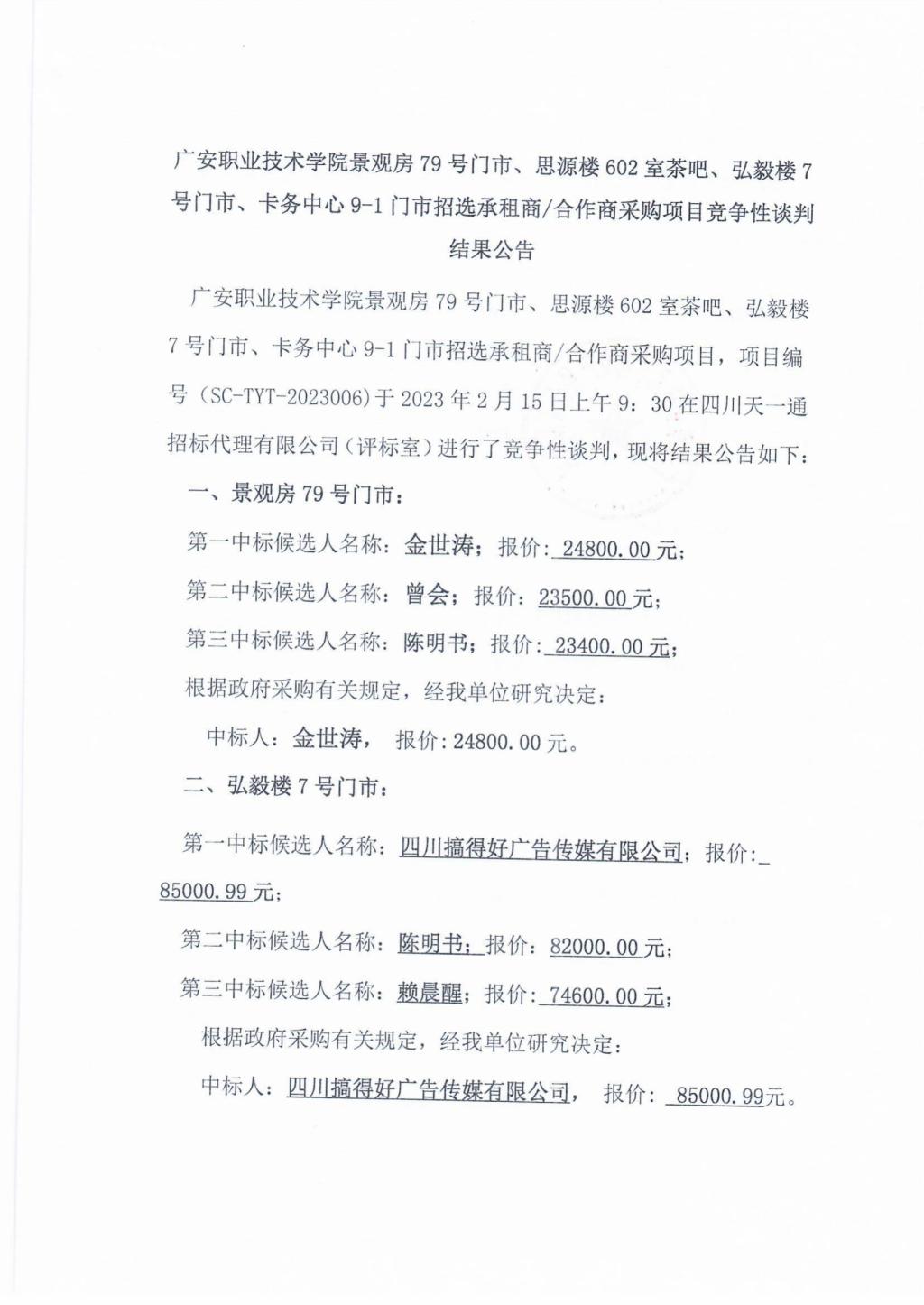 广安职业技术学院景观房79号门市、思源楼602室茶吧、弘毅楼7号门市、卡务中心9-1门市招选承租商/合作商采购项目竞争性谈判结果公告