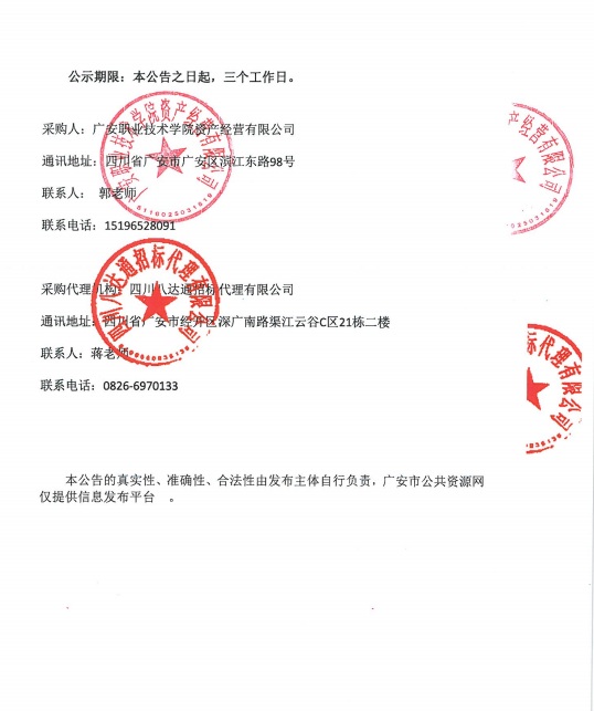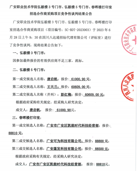 广安职业技术学院弘毅楼3号门市、弘毅楼5号门市、春晖楼打印室招选合作商采购项目竞争性谈判结果公告