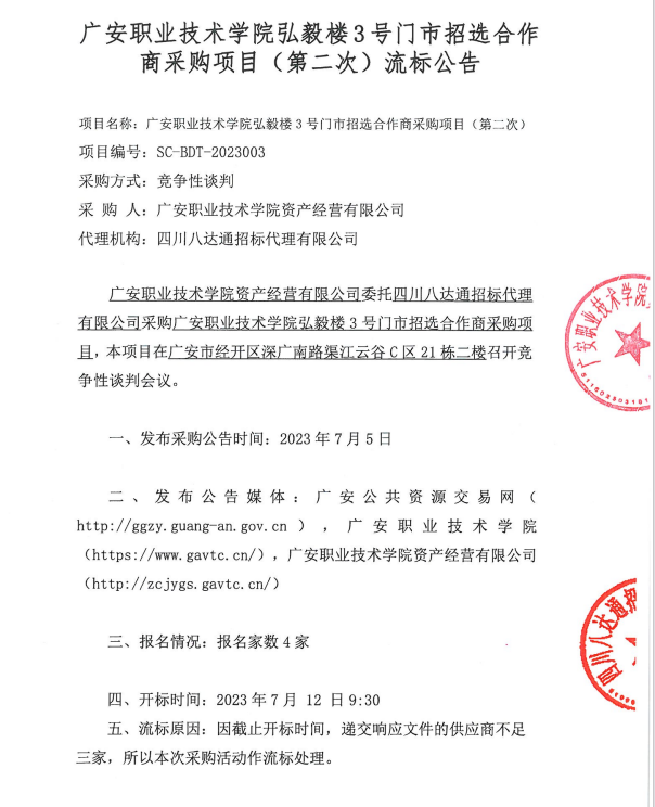 广安职业技术学院弘毅楼3号门市招选合作商采购项目(第二次)流标公告