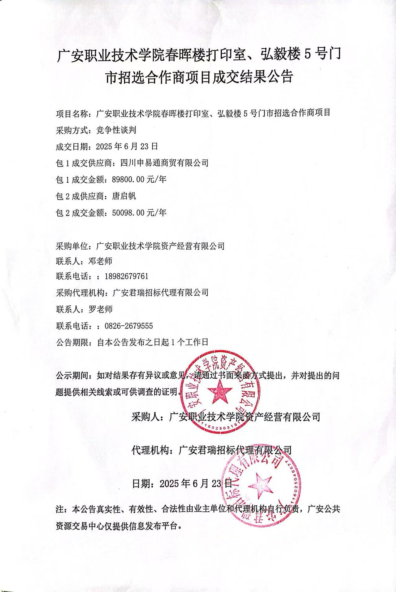 广安职业技术学院春晖楼打印室、弘毅楼5号门市招选合作商项目成交结果公告